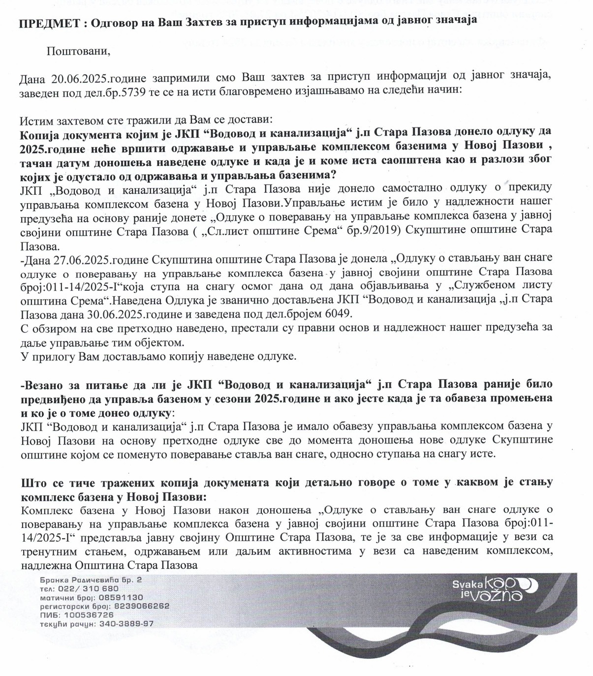 Građani opštine Stara Pazova su dobili deo odgovora o poslovanju bazena u Novoj Pazovi, ali ključno pitanje i dalje visi u vazduhu: zašto se čekalo do 12. juna da JKP „Vodovod i kanalizacija“ najavi povlačenje iz rukovođenja bazenima – i to tik pred otvaranje sezone?