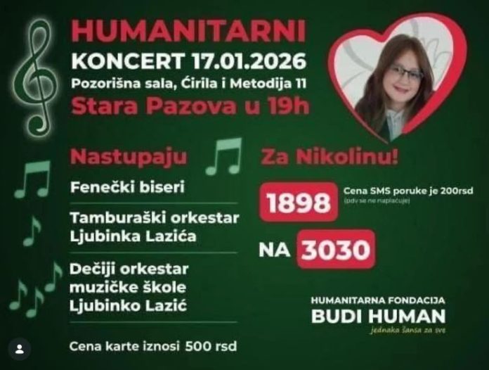 Humanitarni koncert posvećen prikupljanju pomoći za Nikolinu iz Krnješevaca biće održan u petak, 17. januara 2026. godine, u Pozorišnoj sali u Staroj Pazovi, sa početkom u 19 časova.