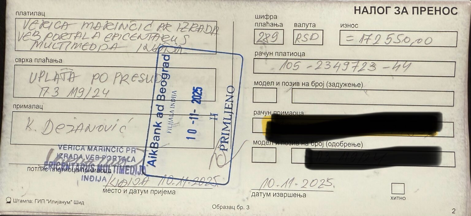 Podsetimo, IN Medija je krajem jula uspela da prikupi novac za plaćanje prve presude, u iznosu od 161.300 dinara, po tužbi Rajka Radića iz Putinaca, koju je takođe zastupao advokat Ališić. I u tom slučaju, uplata je izvršena na račun tužilje – Radićeve ćerke – koja je takođe postala punoletna pre pravosnažnosti postupka.