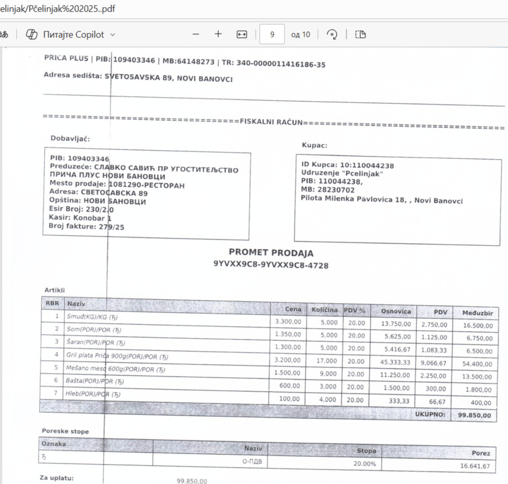 U finansijskim izveštajima, u koje smo imali uvid, navode se i troškovi koji otvaraju dodatna pitanja. Tako se, između ostalog, pominju popravke nameštaja u dva uzastopna projekta, postavljanje pločica, troškovi popravke struje u prostorijama udruženja, putovanja u Crnu Goru i na planinu Rtanj, kao i ručak u restoranu „Priča“ u Banovcima u iznosu od čak 99.850 dinara.