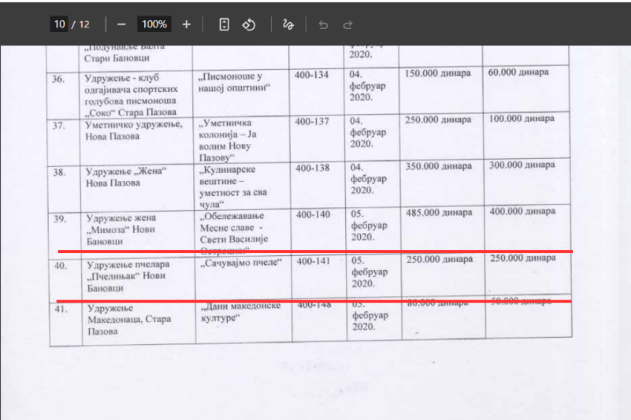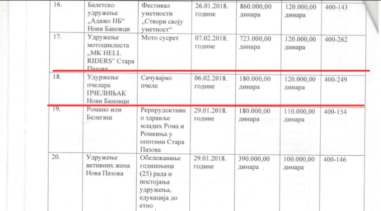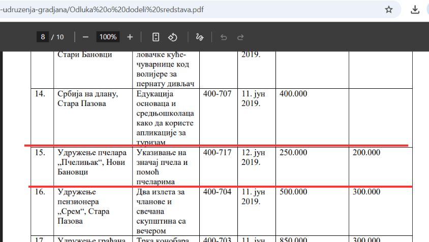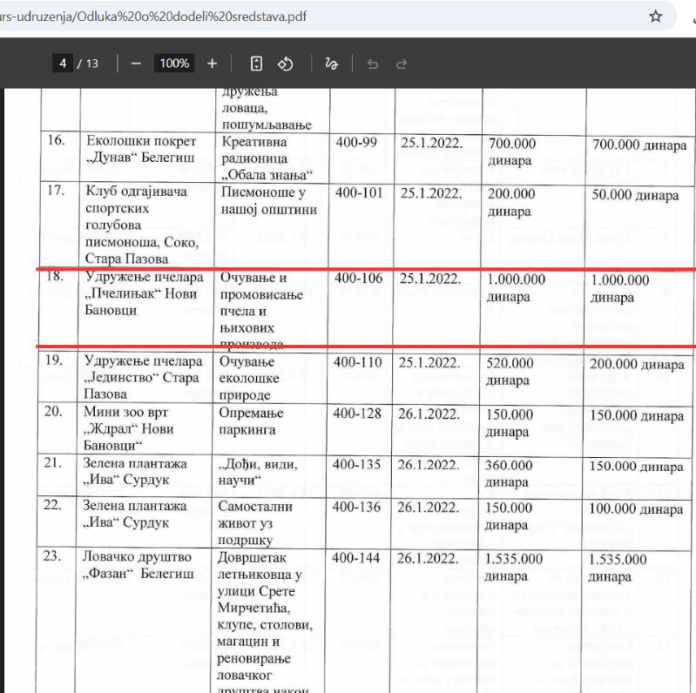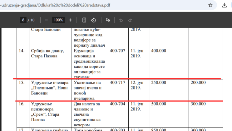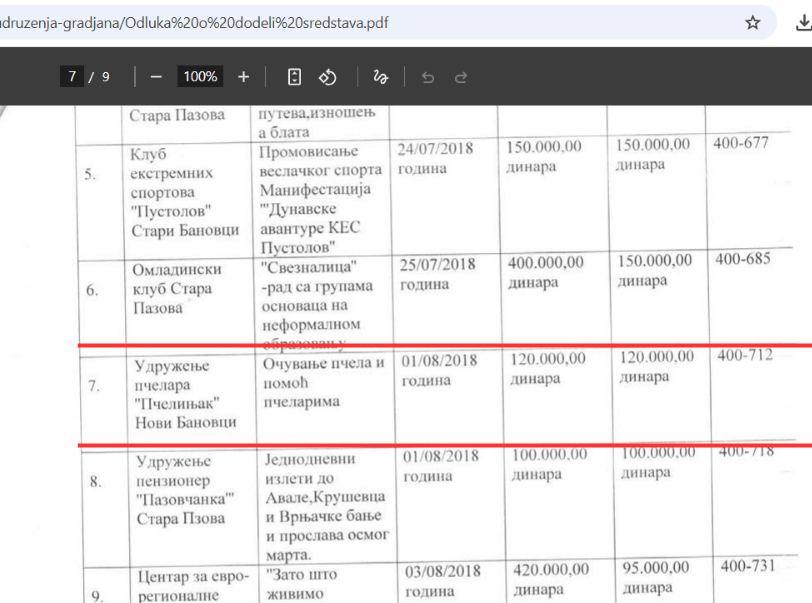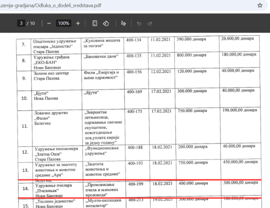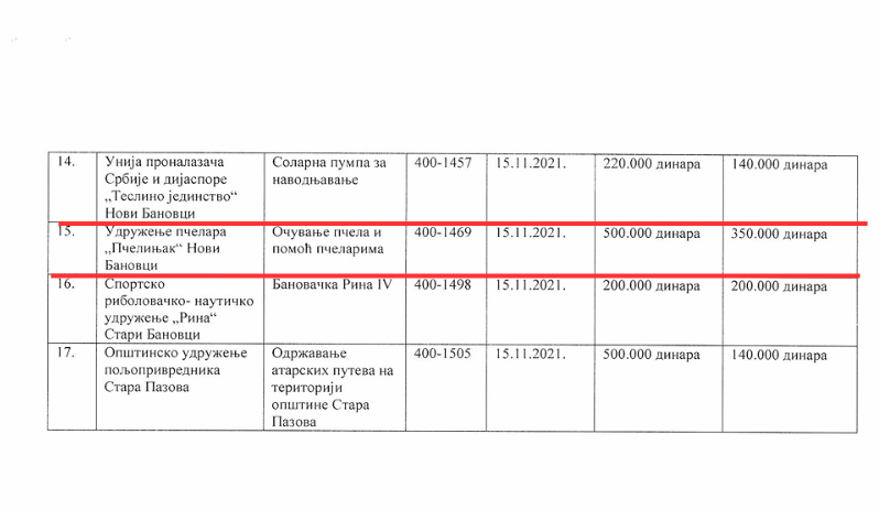 Udruženje pčelara „Pčelinjak“ iz Novih Banovaca, od 2018. do 2025. godine dobilo je ukupno 5.070.000 dinara iz budžeta Opštine Stara Pazova kroz javne konkurse za projekte od javnog interesa, iako u javnosti ne postoje vidljivi tragovi aktivnosti za koje je novac dodeljen.