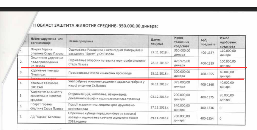Zanimljiv je i podatak da se ime zastupnika ovog udruženja nikada nije pojavilo među podnosiocima prijava na konkursima za dodelu bespovratnih sredstava za nabavku pčelinjih društava, iako se takvi konkursi redovno raspisuju. Drugim rečima, osoba koja vodi udruženje koje godinama dobija sredstva za projekte vezane za pčelarstvo nikada nije konkurisala za podsticaje namenjene samim pčelarima.