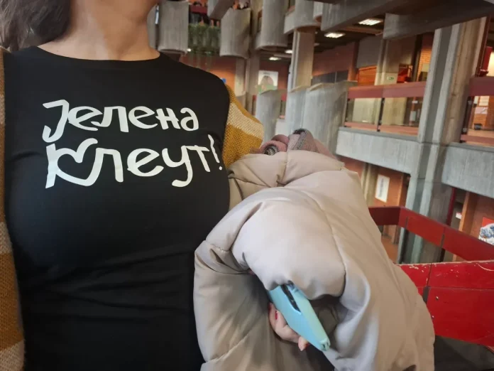 Na protestu, kolege Jelene Kleut nose majice sa njenim imenom unutar kojeg je nacrtano srce, dok studenti poručuju da Filozofski fakultet nije sposoban za nastavu bez nje.