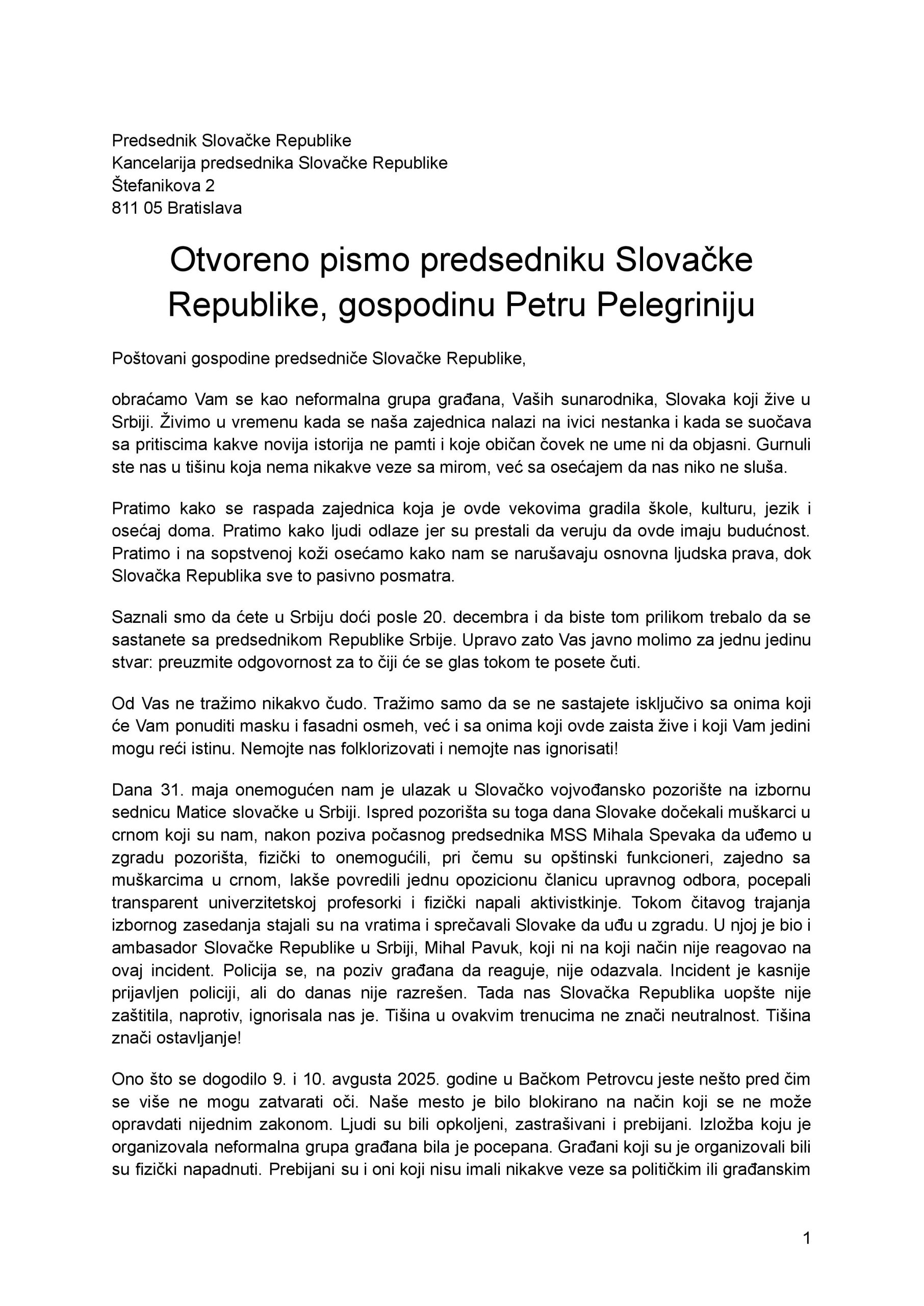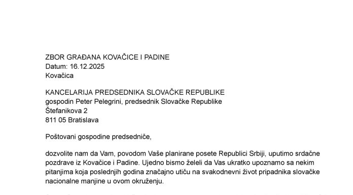 U tri odvojena pisma, koja potpisuju građani iz Kovačice, Padine, Bačkog Petrovca, Stare Pazove, iznose se brojni problemi sa kojima se slovačka nacionalna manjina u Srbiji suočava poslednjih godina – od institucionalne blokade i cenzure, preko pritisaka i pretnji, do fizičkog nasilja i sistematskog potiskivanja slovačkog jezika i kulture iz javnog prostora.