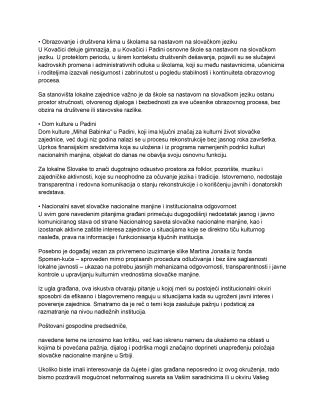 U pismu građana iz Kovačice i Padine posebna pažnja posvećena je slučaju privremenog iznošenja slike Martina Jonaša iz Spomen-kuće bez javne odluke, ukidanju televizijskih i internet sadržaja na slovačkom jeziku, problemima u školama sa nastavom na slovačkom, kao i višegodišnjoj nedovršenoj rekonstrukciji Doma kulture „Mihal Babinka“ u Padini. Ukazuje se i na izostanak reakcije i odgovornosti Nacionalnog saveta slovačke nacionalne manjine.