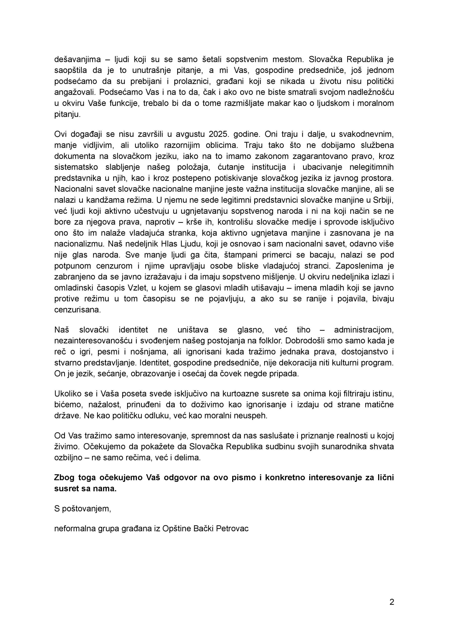Zajednički zahtev svih potpisnika jeste da predsednik Slovačke tokom posete Srbiji ne razgovara isključivo sa zvaničnim i režimskim predstavnicima, već i sa građanima koji, kako navode, jedini mogu da prenesu stvarnu sliku položaja Slovaka i drugih manjinskih zajednica u Srbiji.