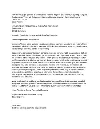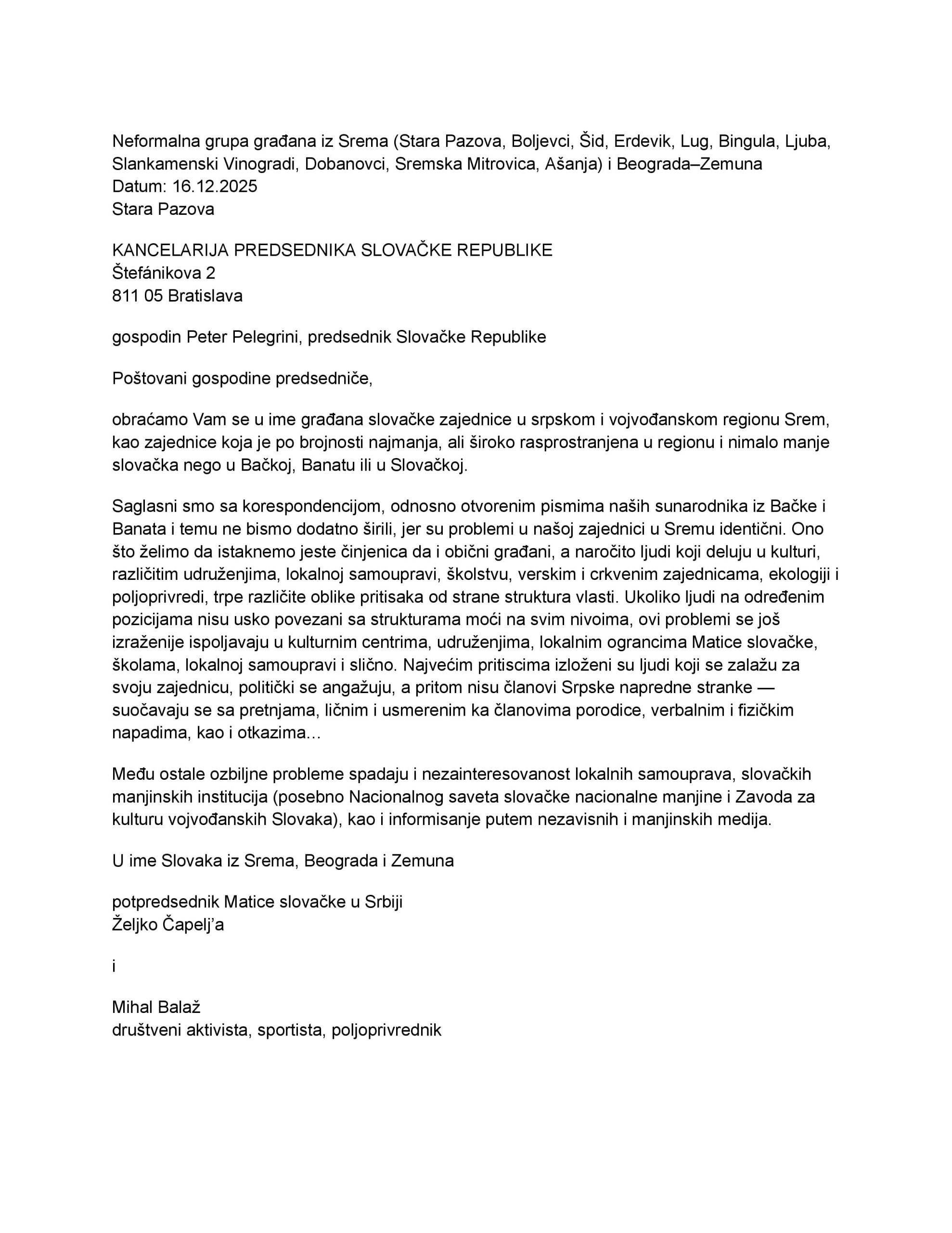 „Ne tražimo čudo, već da nas saslušate“, poručuju u pismima, uz očekivanje da Slovačka Republika pokaže da sudbinu svojih sunarodnika u Srbiji shvata ozbiljno – ne samo kroz deklarativnu podršku, već kroz konkretan dijalog i delovanje.