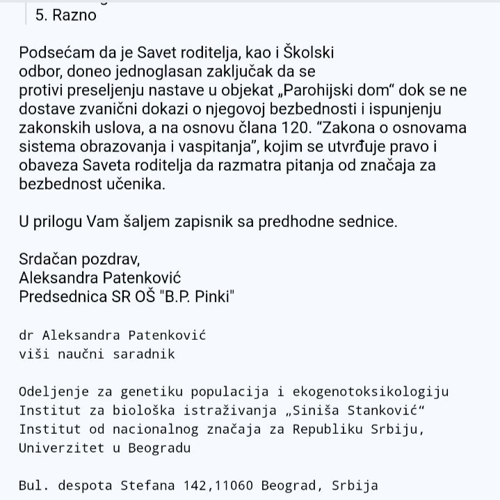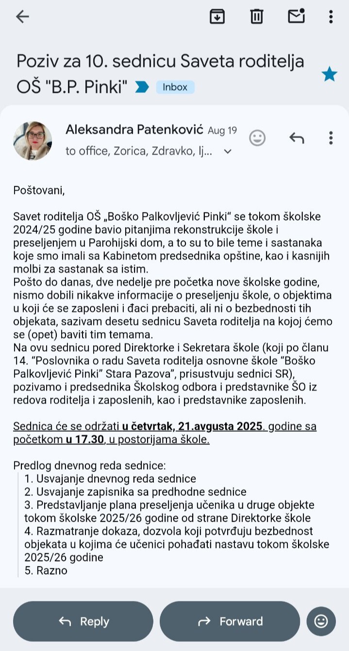 Roditelji i Savet jasno ističu da bezbednost dece mora biti prioritet i da nijedna procedura ili investicija ne sme da ugrozi osnovno pravo na sigurno i kvalitetno obrazovanje. Dok rekonstrukcija kasni, deca ulaze u novu školsku godinu u neuslovnim prostorima, mlađi i sa smanjenim fondom časova, a javnost i dalje ne zna ni ko je odgovoran za kašnjenje, ni zašto milioni evra već uloženi u projekat nisu praćeni transparentnom dokumentacijom.