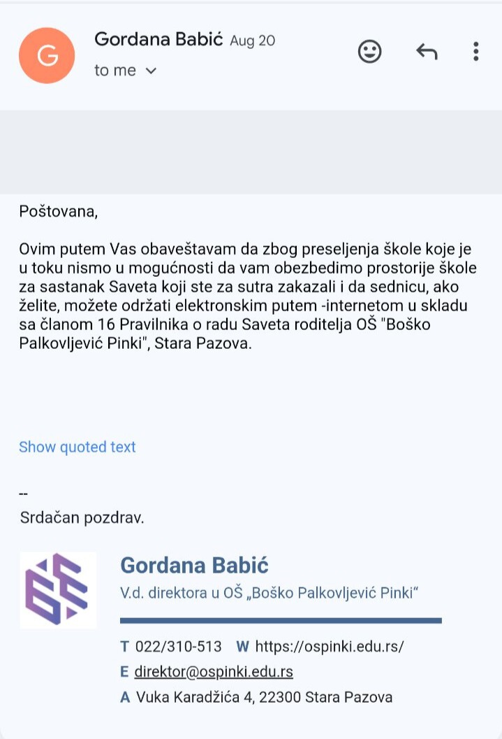 Roditelji i Savet škole od početka prošle školske godine pokušavaju da uspostave saradnju sa lokalnom samoupravom i školom kako bi dobili uvid u dokumentaciju koja garantuje bezbednost dece. Njihovi zahtevi su ignorisani, a nova VD direktorka škole nije se pojavila na poslednjoj sednici Saveta roditelja, odbijajući trentno bilo kakav vid saradnje. Poslednja sednica, održana je u dvorištu Parohijskog doma, jer je kapija Pinki škole bila zaključana, i jasno je pokazala zabrinutost roditelja zbog bezbednosti dece, što u objektima u kojima su smešteni, što na putu do škole, pre svega Aranicki škole u koju su smešteni prvaci i drugaci. Pokrenuta je inicijativa da se od lokalne samouprave zahteva prevoz dece do Aranicki škole.