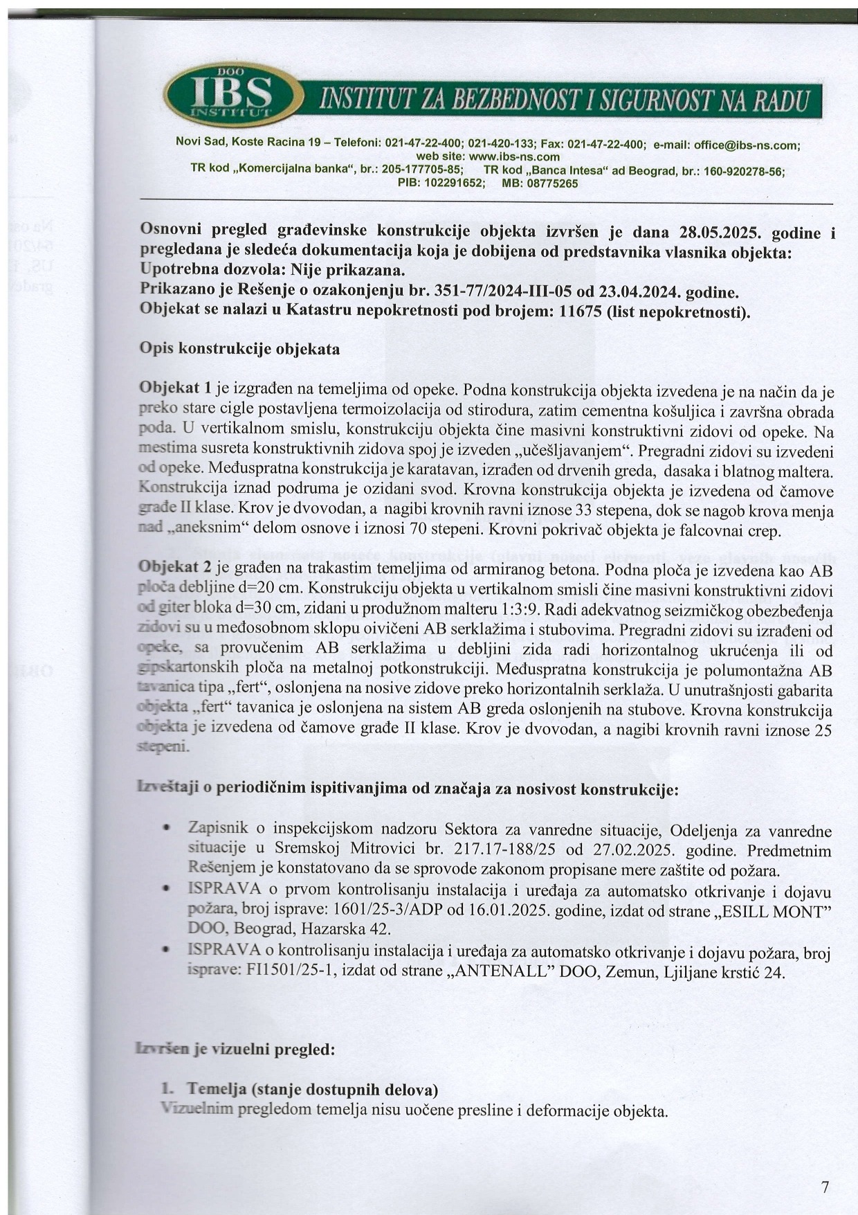 U izveštaju o građevinskoj konstrukciji, koji je radila privatna firma „Institut za bezbednost i sigurnost na radu“ iz Novog Sada, jasno stoji: „Upotrebna dozvola: nije prikazana.“ Izvštaj je napravljen bez ikakvih merenja i proračuna, opisno, a ocena stanja konstrukcije i bezbednosti za upotrebu nije nigde povezana sa upotrebom u javne svrhe za školu, što roditelje plaši.