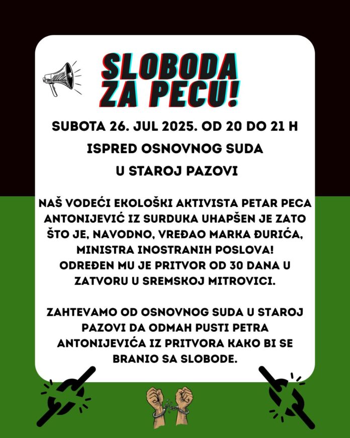 Građani su pozvani na protest ispred Osnovnog suda u Staroj Pazovi u subotu, 26. jula, od 20 do 21 čas. Povod okupljanja je, kako se navodi u pozivu, „hapšenje ekološkog aktiviste Petra Antonijevića iz Surduka zbog navodnih pretnji ministru spoljnih poslova Marku Đuriću“. Na protestu će biti zatraženo da se Antonijeviću omogući da se brani sa slobode.