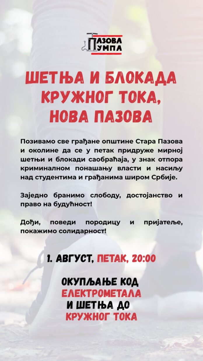 U petak, 1. avgusta, građani opštine Stara Pazova ponovo će organizuju protestnu šetnju i blokadu saobraćaja. Okupljanje je najavljeno za 20 časova kod Elektrometala u Novoj Pazovi, nakon čega će učesnici krenuti u šetnju do kružnog toka kod BIG centra.