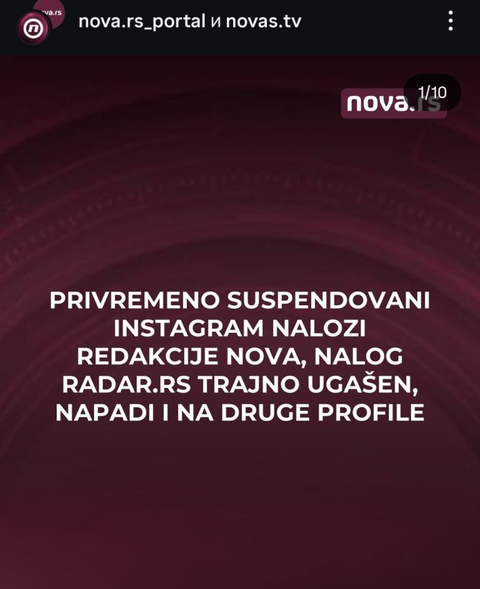 Tri Instagram naloga Nova.rs privremeno suspendovana, dok je nalog portala Radar.rs trajno ugašen; napadi su pogodili i druge medijske i aktivističke profile.