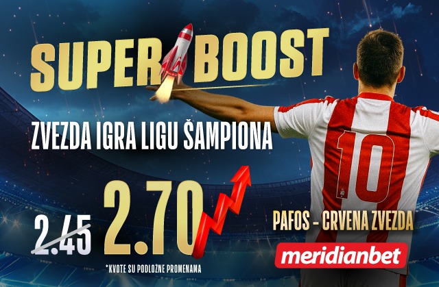 A, kakve su šanse da će pobediti Pafos na gostujućem terenu? Sportska kladionica Meridian donosi sjajnu ponudu i najveći kvotu na Zvezda prolazi dalje. Umesto kvote 2.60, uz opciju SUPERBOOST – nova kvota je 2.80, što znači da je ne smete propustiti!