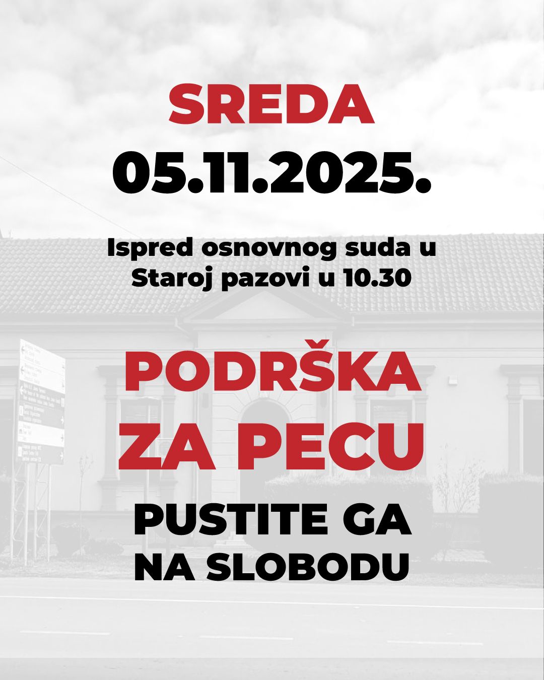 Građanske inicijative „Pazova uz studente“ i ekološki pokreti iz Belegiša pozivaju građane da se okupe ispred suda u 10.30 časova i pruže podršku Antonijeviću, „koga već četiri meseca bespravno drže u pritvoru“.