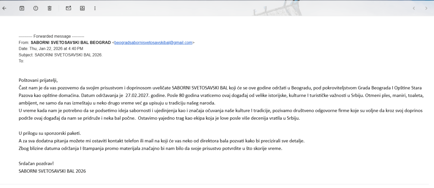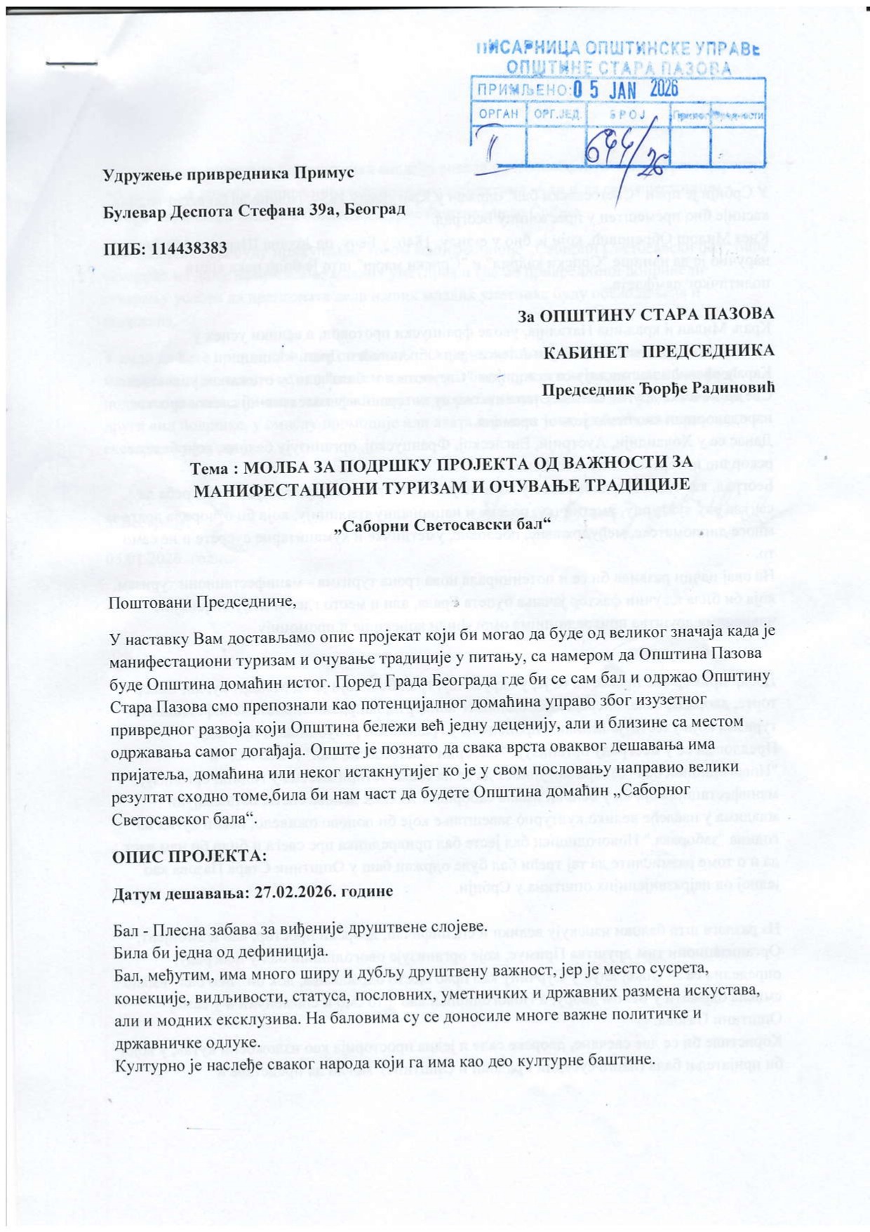 Informacija koju smo dobili od nekolicine privrednika sa teritorije naše Opštine da će se 27. februara 2026. godine na imanju The Jockey Club u Surčinu održati Saborni svetosavski bal,izazvala je značajan stepen opreza među potencijalnim učesnicima i sponzorima koji su nam se obratili da bi saznali nešto više. Ideja koju organizator navodi o oživljavanju svetosavske tradicije naišla je na pitanja o transparentnosti, finansijskoj pouzdanosti i ulozi lokalnih vlasti. Kao visoki pokrovitelji ovog događaja navode se Grad Beograd i Opština Stara Pazova.