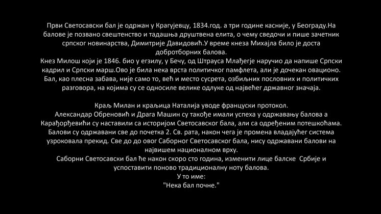 Organizatori tvrde u sponzorskom paketu, da bal oživljava tradiciju svetosavskih balova iz 19. veka, kada su pod dinastijama Karađorđević i Obrenović okupljali kulturnu i društvenu elitu. Najavljuje se spoj ceremonijalnog plesa i savremenog kulturnog protokola.